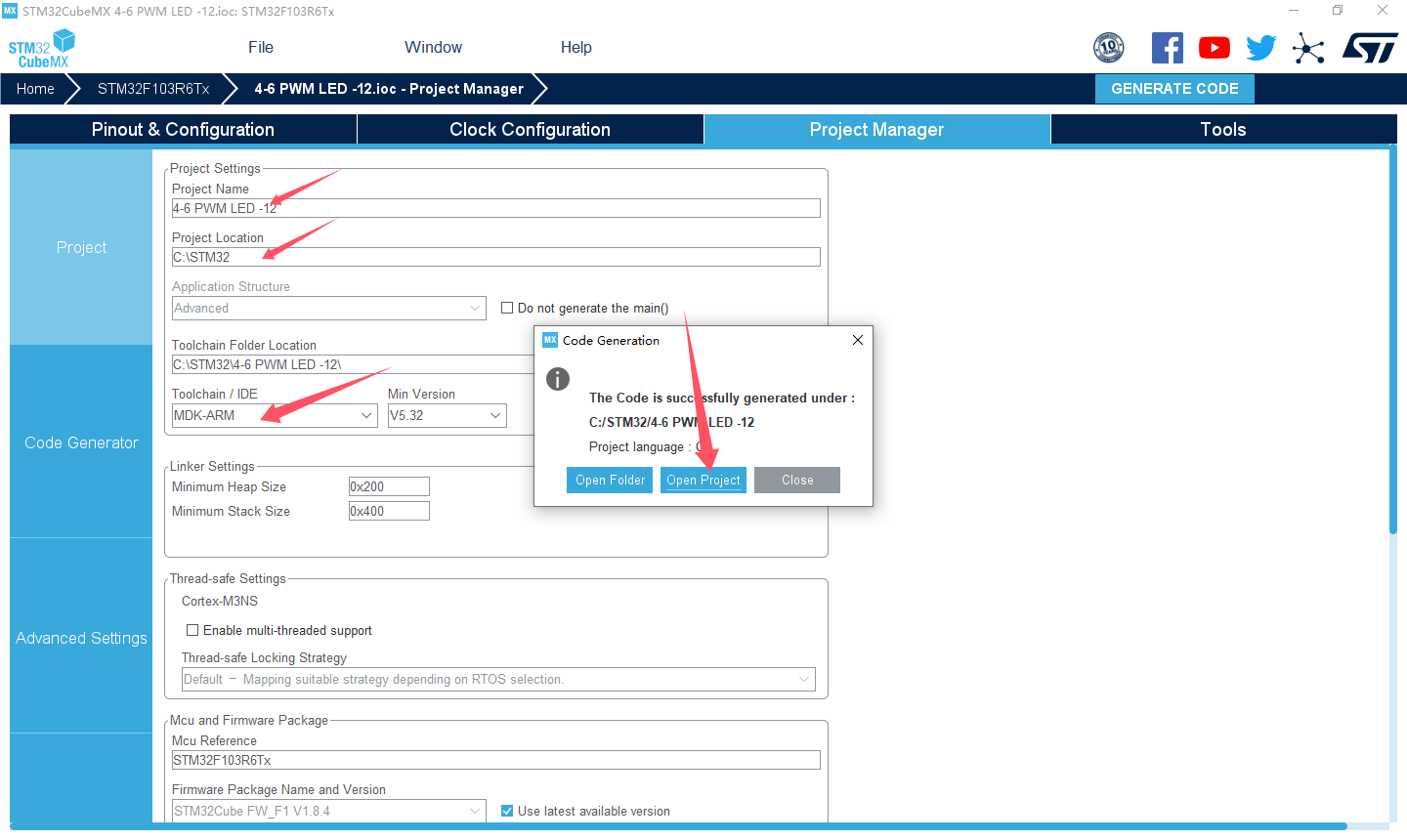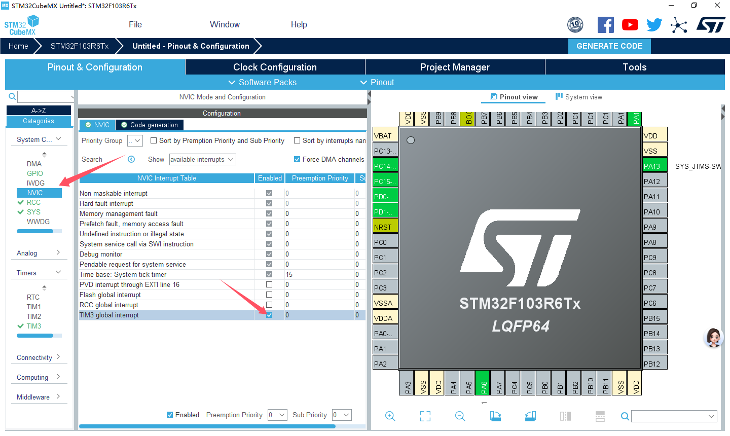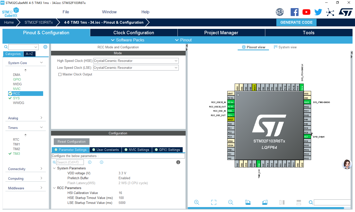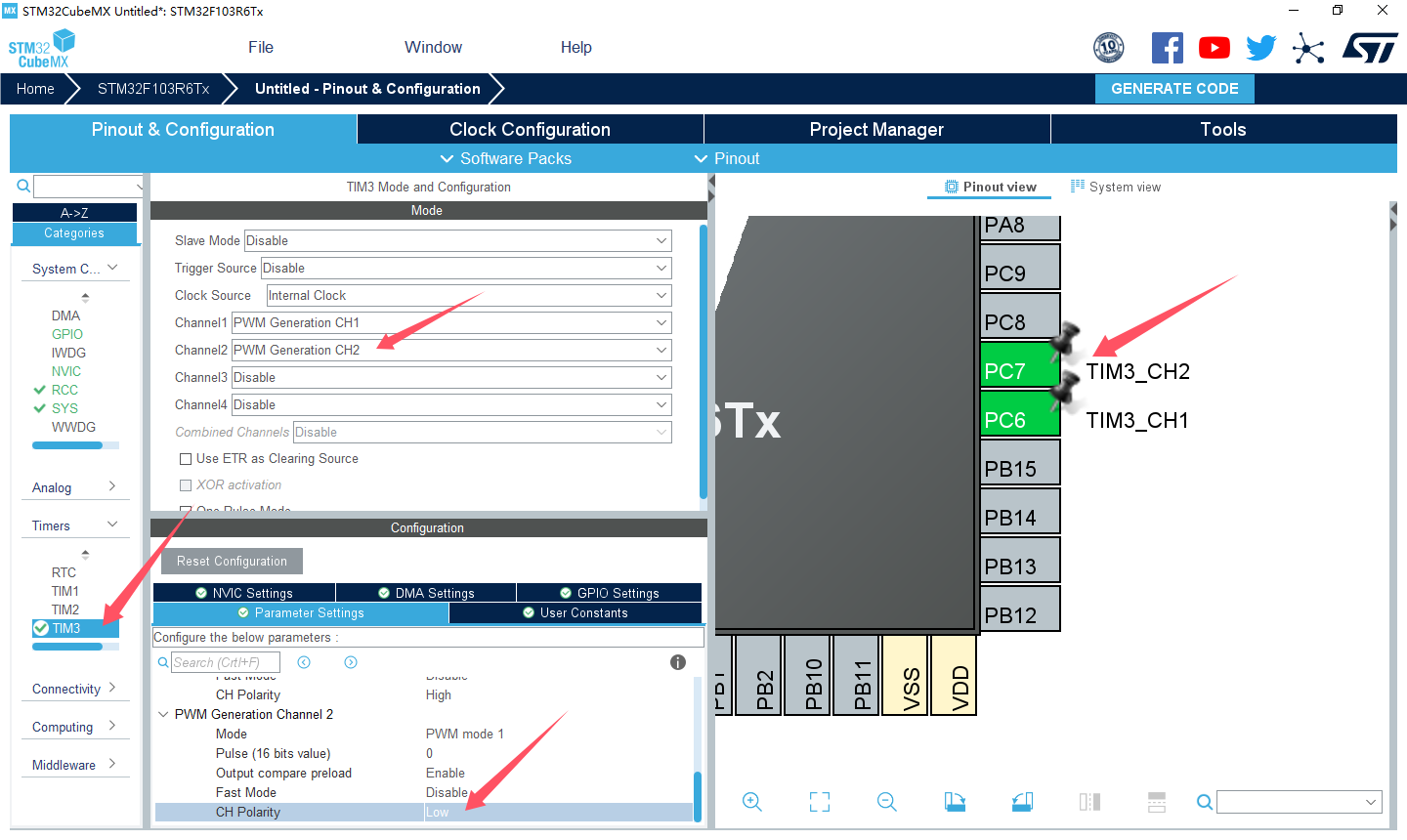 本例说明如何使用 STM32CubeMX 和 HAL 库函数配置TIM3 产生可变占空比的PWM 实现LED 亮度变化的“呼吸灯”