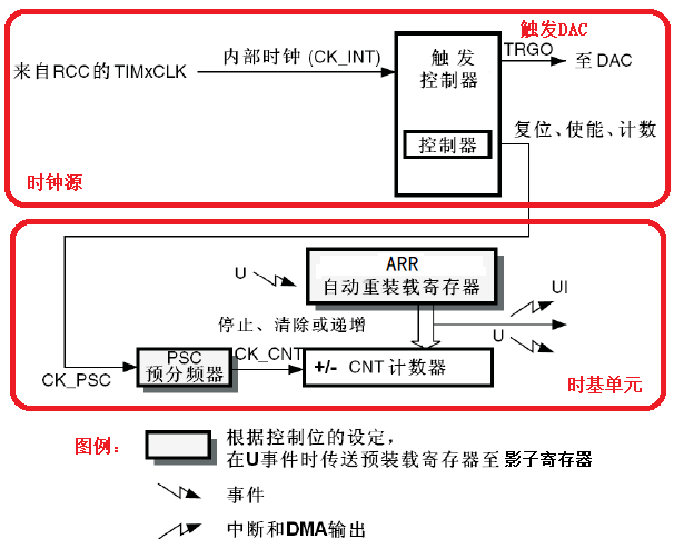 TIM6和TIM7由时钟源和时基单元组成,如图4-13所示。