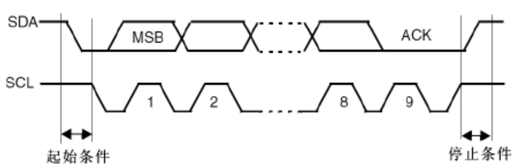 (2) 在数据传送过程中,数据在SCL线为低电平时发生变化;当SCL线为高电平时,SDA线必须保持稳定状态,不允许有跳变。当SCL线为高电平时,SDA线的任何电平变化都将被看作总线的开始条件(信号)或停止条件(信号),如图4-25所示。