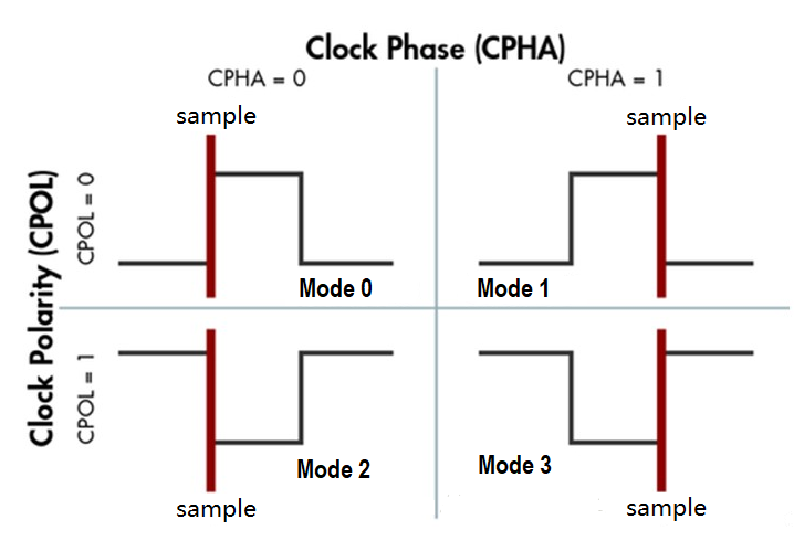 SPI控制寄存器1的CPOL(Clock Plarity,时钟极性)位和CPHA(Clock Phase,时钟相位)位,能够组合成四种可能的时序关系,分别是Mode 0(CPOL,CPHA=0,0)、Mode 1(CPOL,CPHA=0,1)、Mode 2(CPOL,CPHA=1,0)、Mode 3(CPOL,CPHA=1,1),如图4-38所示。
