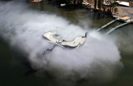 人工智能气候控制系统读取时刻变化着的气温、湿度、风速和风向。经过中央电脑处理,调整31500个喷雾嘴的水压。进入雾团,视觉和声觉参照物一律消逝,只剩下光学“乳白”现象和喷雾嘴发出的“白噪声”。模糊并非标新立异。与巨大环境相对,模糊是低调的:空无一物仅关注视觉本身。