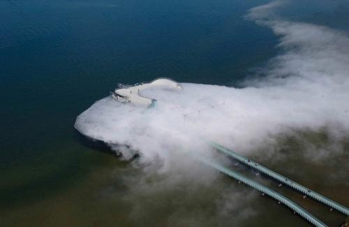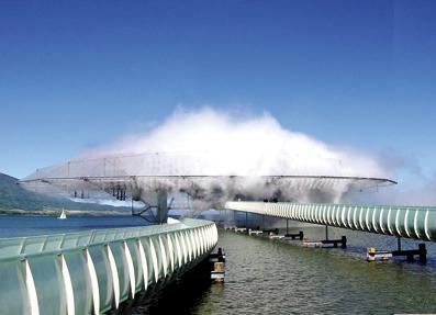 瑞士模糊大厦采用轻质结构,100m宽、64m深、25m高。主要建筑材料就地取用水。水从湖里泵上来,过滤,通过紧密排排的高压喷嘴喷放出细密水雾。形成的雾团成为自然与人工力量的互动。