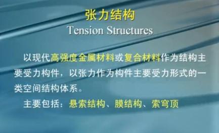 张力结构从满足一定拓扑关系的几何构造和外形中,通过预应力过程获取刚度,从而使结构具有满足功能要求的建筑造型和承载能力。因此张力结构的分析、设计与施工的过程紧紧围绕结构的拓扑、外形及刚度展开。在当前的工程中,张力结构一般都不是一种简单的型式,而是多种型式的集成,因此各文献对其分类也不尽同,沈世钊院士将张力结构分为:悬索结构、膜结构、索穹顶。