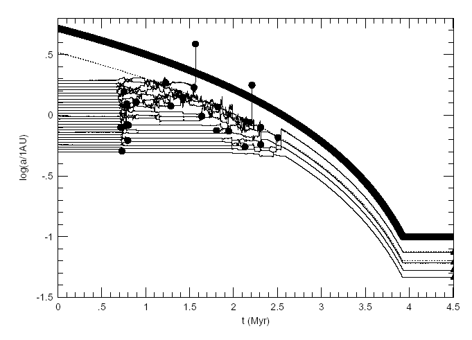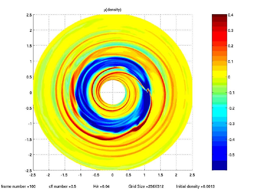 (上图:流体模拟行星形成后附近行星盘形成空隙,行星在盘作用下会发生迁移)