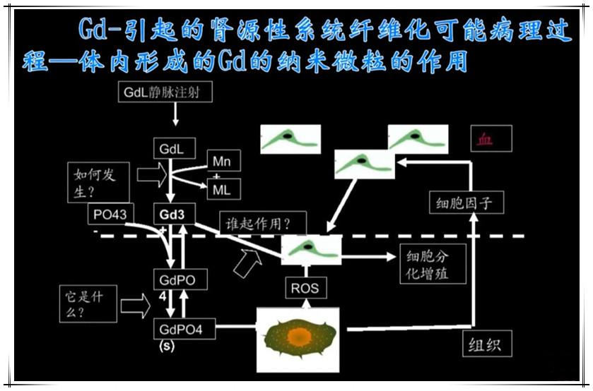 含钆引起的肾源行系统纤维化可能病理过程示意图: