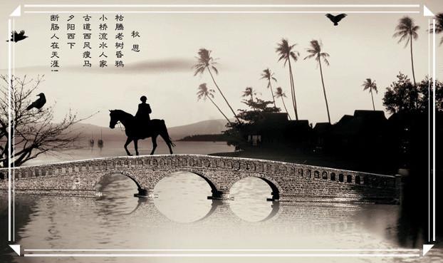 中国古典诗歌的意象虽然可以直接拼合,意象之间似乎没有关连,其实在深层上却互相钩连着,只是那起连接作用的纽带隐蔽着,并不显露出来。这就是前人所谓峰断云连,辞断意属。也就是说,从象的方面看去好象是孤立的,从意的方面寻找却有一条纽带。这是一种内在的、深层的联系。意象之间似离实合,似断实续,给读者留下许多想象的余地和进行再创造的可能,因此读起来便有一种涵咏不尽的余味。1. 如马致远《天净沙.秋思》“枯藤老树昏鸦,小桥流水人家,古道西风瘦马。夕阳西下,断肠人在天涯”