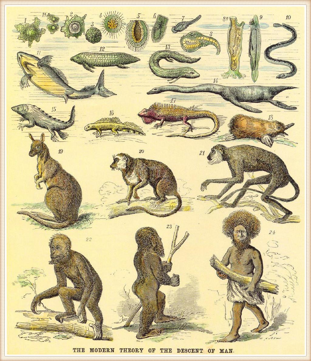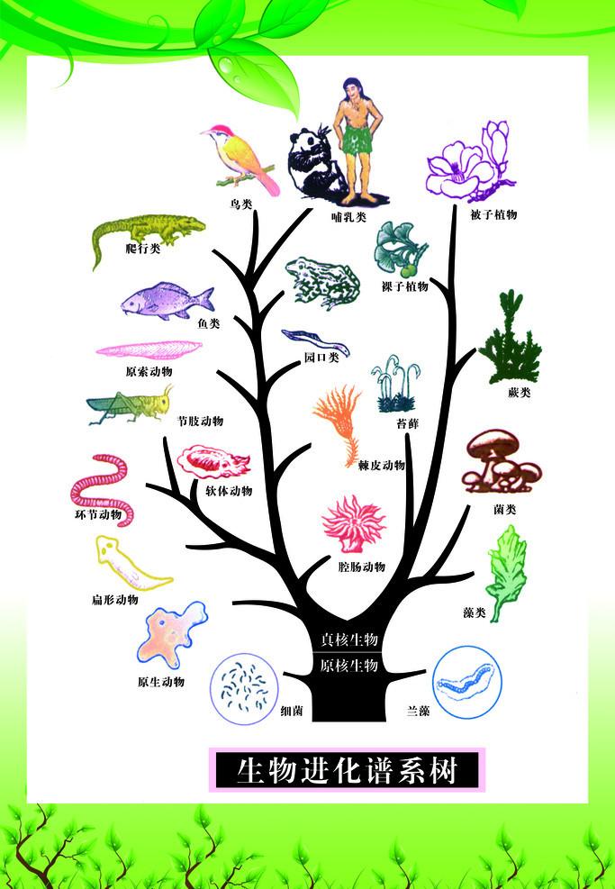 地球上的生命,从最原始的无细胞结构生物进化为有细胞结构的原核生物,从原核生物进化为真核单细胞生物,然后按照不同方向发展,出现了真菌界、植物界和动物界。植物界从藻类到裸蕨植物再到蕨类植物、裸子植物,最后出现了被子植物。动物界从原始鞭毛虫到多细胞动物,从原始多细胞动物到出现脊索动物,进而演化出高等脊索动物──脊椎动物。脊椎动物中的鱼类又演化到两栖类再到爬行类,从中分化出哺乳类和鸟类,哺乳类中的一支进一步发展为高等智慧生物,这就是人。
