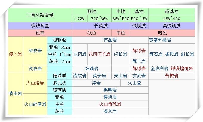 火成岩(IgneousRock)由岩浆(Magma)直接凝固而成。高温之岩浆在从液态冷却中结晶成多种矿物,矿物再紧密结合成火成岩。化学成分各异之岩浆,最後成为矿物成分各异之火成岩,种类繁多,细分之有数百种。如依其含硅量之高低做最简明之分类,火成岩有酸性(Felsic)、中性(Intermediate)、碱性(Mafic),及超基性(Ultrabasic)四大类。同时火成岩之晶体,因结晶时在地下之深度 不一亦有粗细之别;将此分别代表深浅之粗细做为矿物成分以外之另一分类依据。