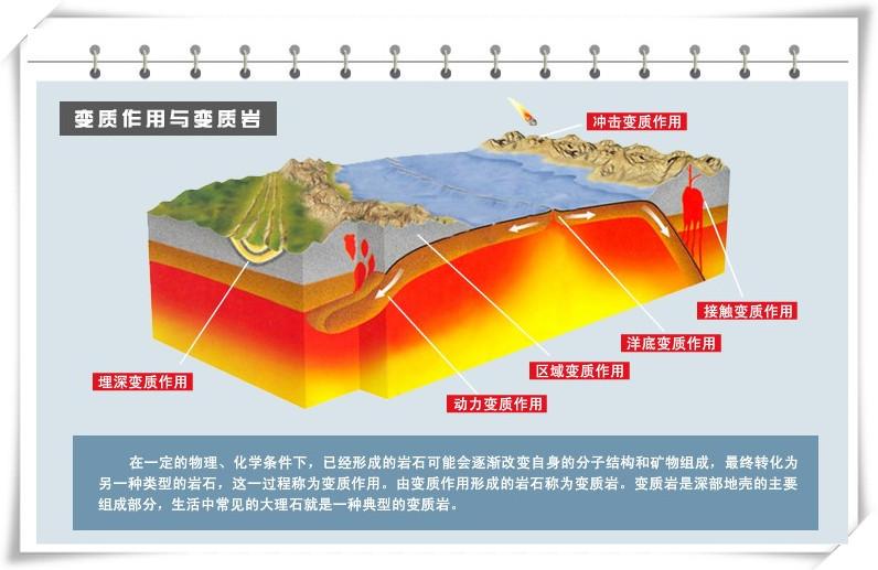变质岩是在高温高压和矿物质的混合作用下由一种岩石自然变质成的另一种岩石。质变可能是重结晶、纹理改变或颜色改变。变质岩是在地球内力作用,引起的岩石构造的变化和改造产生的新型岩石。这些力量包括温度、压力、应力的变化、化学成分。固态的岩石在地球内部的压力和温度作用下,发生物质成分的迁移和重结晶,形成新的矿物组合。如普通石灰石由于重结晶变成大理石。