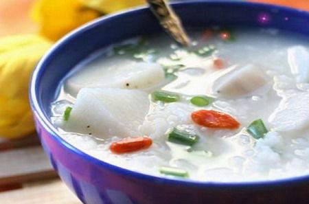 [原料] 山药块30克,葛根粉30克,枸杞子20克,白萝卜丝25克,芹菜带叶(切成小段)25克,粳米200克。