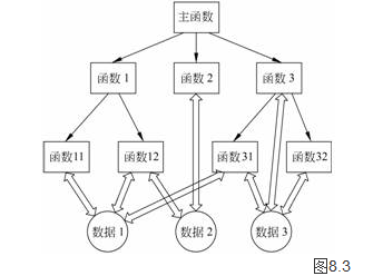 传统的面向过程程序设计是围绕功能进行的,用一个函数实现一个功能。所有的数据都是公用的,一个函数可以使用任何一组数据,而一组数据又能被多个函数所使用(见图8.3)。
