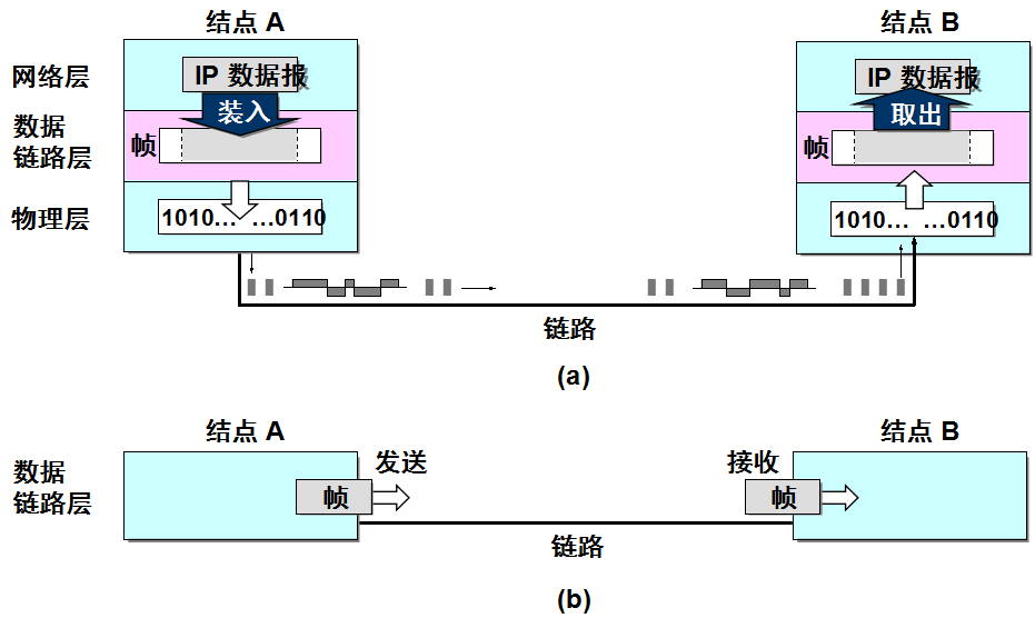 注意:物理层的传输单位是二进制位(bit),而数据链路层是以帧(Frame)为传输单位,而且是在LAN内节点之间的传输。(如果传输数据时经过中间节点,那就是广域网,存在路由选择问题,这是网络层考虑的问题)。