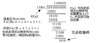 本例余数为1010,它就是冗余码。因此,发送方传输前需要将冗余码“1010”附加到信息“1011001”之后,因此实际传输的CRC码为“10110011010”。