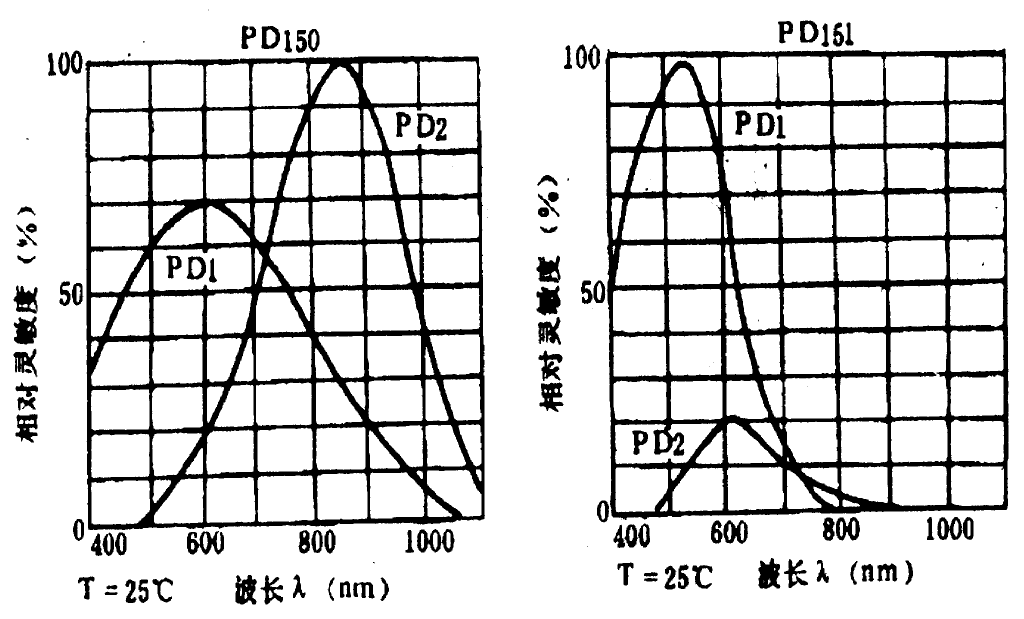 在一块单晶硅基片上作了两个PN结的三层结构,如下图所示。两个光电二极管PD1及PD2反向连接。光电二极管的光谱特性与PN结的厚薄有很大关系。PN结的面做得薄一点对蓝光的灵敏度高。PD1与PD2的厚薄不同所以光谱特性也不同,如下图所示。
