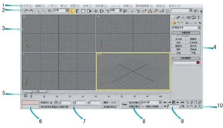 先来看大块你会看到共有10个部分。这十个部分就把整个三维工作集合到整个软件里了。非常的简洁。十个区域分工各不相同,互相之间有机的结合到了一起。首先你先理解一下他们都是做什么工作的就可以了。让我们来详细说明。 1 菜单栏 最上方菜单栏是 3ds max所有工具的集合。在这里拥有 3ds max所有的命令工具。基本可用的所有的命令在这里都能找到。这是你第一个需要认识的项目。 2 主工具栏 在MAX菜单栏下方是主工具栏,常用的主要工具都在这里存放着。 3dsmax把这些最常用的工具在这里做了一个集合,是我们最长点击的一个部分。可以理解为快捷工具栏。常用的工具在这里找,不常用的工具到菜单里找。反正所有工具就在这两个地方,没有另外的常用工具了。这些工具的按钮是很大的,找起来好找,非常实用。 3 四个视口 你看到这四个带网格的视图就是 dsmax的四个视口,所有的物体和多边形操作都在这里进行。也是我们的工作区。就像工作台或者手术台一样,他就是我们的模型手术台了。