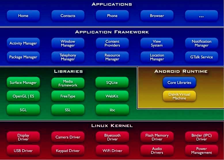 Android的系统架构和其操作系统一样,采用了分层的架构。android分为四个层,从高层到低层分别是应用程序层、应用程序框架层、系统运行库层和linux核心层。应用程序Android会同一系列核心应用程序包一起发布,该应用程序包包括email客户端,SMS短消息程序,日历,地图,浏览器,联系人管理程序等。所有的应用程序都是使用JAVA语言编写的。应用程序框架开发人员也可以完全访问核心应用程序所使用的API框架。该应用程序的架构设计简化了组件的重用;任何一个应用程序都可以发布它的功能块并且任何其它的应用程序都可以使用其所发布的功能块(不过得遵循框架的安全性限制)。同样,该应用程序重用机制也使用户可以方便的替换程序组件。