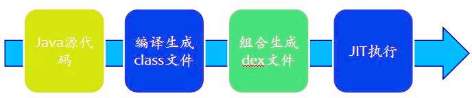 移动设备的内存和速度使得普通的JVM无法高效运行Dalvik VM重新实现了JVM将类文件组合生成一个或多个Dalvik可执行文件(.dex)重用了类中的重复信息,比未压缩的jar减小了一半空间*优化了垃圾回收*使用了JIT(Just-In-Time)使用寄存器作为主要的数据存储单元提升性能