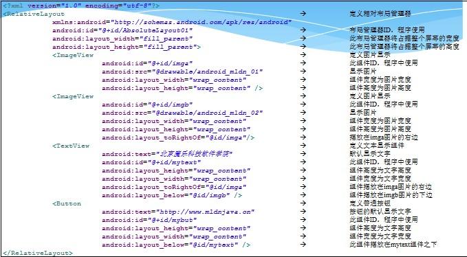 相对布局的创建可以使用如下两个类完成:相对布局管理器:RelativeLayout