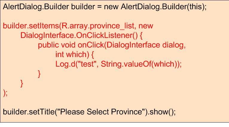 通过AlertDialog.Builder中的setItems()设置内容和事件监听