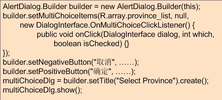 通过Builder中的setSingleChoiceItems()设置内容和事件监听