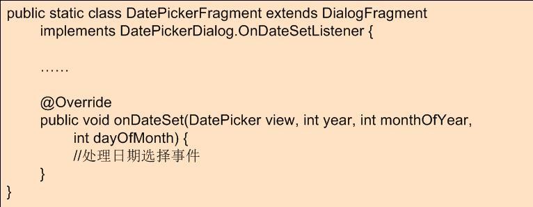 实现DatePickerDialog.OnDateSetListener接口处理日期选择