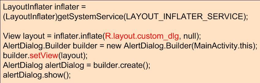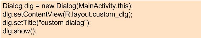 自定义对话框的实现思路,所谓自定义就是要摆脱对话框的固有模式,显示自定义的设计首先需要做的是通过布局的方式将自定义内容的布局设计出来一般会在res/layout下通过xml文件存放自定义的设计然后通过对话框提供的能力将自定义的布局显示在对话框中Dialog和AlertDialog类都提供了使用自定义内容的基础