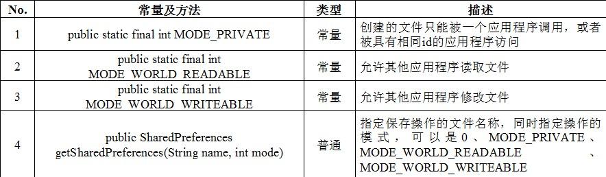 由于SharedPreferences和SharedPreferences.Editor两个都是接口,所以要想取得SharedPreferences接口的实例化对象,还需要Activity类中的几个常量和方法的支持。