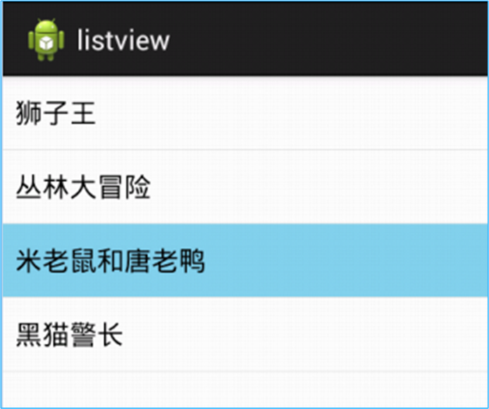 列表控件是界面设计中一种常用的控件,主要用于展现一系列数据项供用户选择或浏览,比如:收件箱中的邮件标题列表、通讯录中的联系人列表、注册用户时的城市选择列表Android系统中提供了多种形式的列表展现、单选列表、多选列表、可展开列表ListView控件用于以列表形式显示数据,ListView采用MVC模式将前端显示和后端数据进行了分离、ListView装载数据时并不使用ListView本身的方法*通过指定一个Adapter对象给ListView提供数据、ListView显示效果如下
