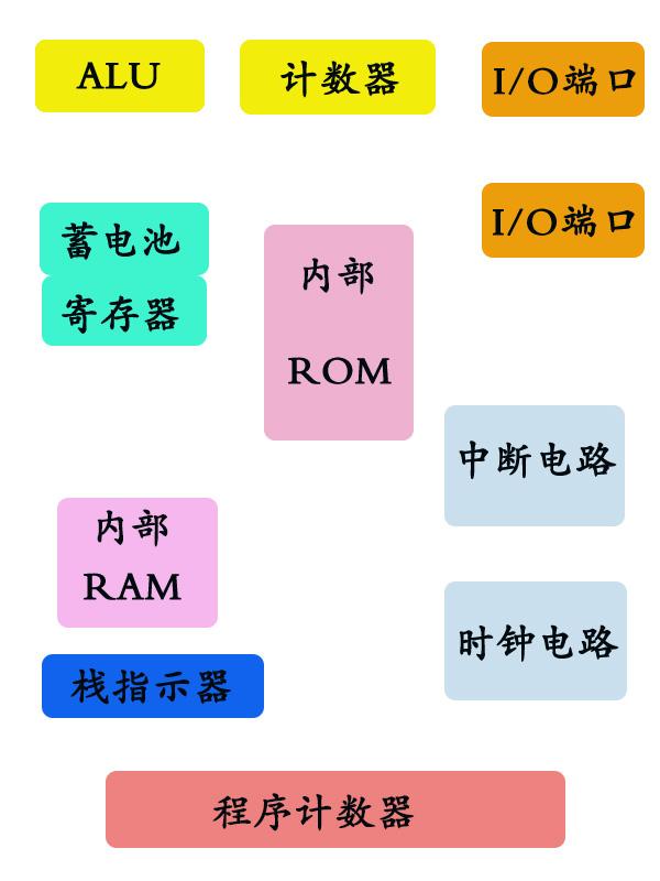 下图显示了一个典型的微控制器(单片机)框图,也就是一个真正的电脑芯片。设计包含了在微处理器CPU所发现的所有特性:ALU、PC、SP和寄存器,同时它还添加了制作一个完整的计算机所需要的其它功能,比如说:ROM、RAM、并行I / O、串行I / O、计数器和一个时钟电路。
