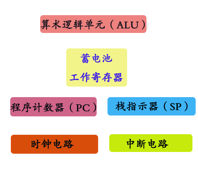 下图显示了一个关于微处理器CPU的框图。它包含了一个算术逻辑单元(ALU)、一个程序计数器(PC)、栈指示器(SP)、一些工作寄存器、一个时钟计时电路和中断电路。