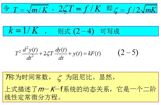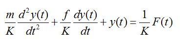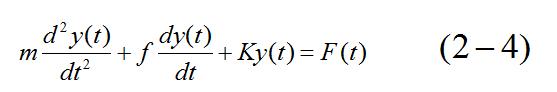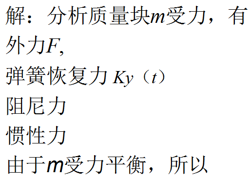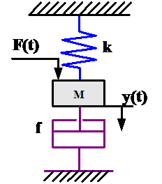 例:设有一弹簧质量 阻尼动力系统如图所示,当外力F(t)作用于系统时,系统将产生运动,试写出外力F(t)与质量块的位移y(t)之间的动态方程。其中弹簧的弹性系数为k,阻尼器的阻尼系数为f,质量块的质量为m。