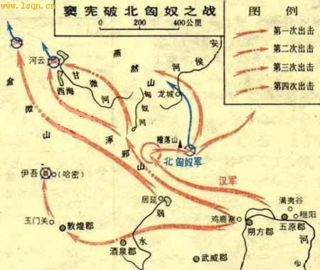 所以匈奴抢劫边郡,杀掠吏民,给汉朝政府造成很大的威胁。自从汉朝建立以来,一直处于和匈奴敌对和战争之中。经过汉朝几代皇帝的努力到汉武帝时期,国力强大,物资丰盈,对匈奴进行大规模的反击。从公元前134年经过30年的先后打通了河西走廊,占领浑邪王故地,置武威、张掖、酒泉、敦煌四郡,移民实边,修驿站,置亭障,立烽火台,通渠开垦,加强警备,以保中西交通。而匈奴日益向西北退却,迁到外蒙。此后,汉武帝对匈奴又进行了几次讨伐,但以失利告终。公元前99年派李陵率步兵五千人出击匈奴被匈奴包围,遂降匈奴。公元前90年派李广利率军七万出击匈奴。李广利由于卷入汉朝内部争斗,其妻子均被逮捕,故恐惧不安。加上匈奴单于亲率五万骑兵来阻,汉军大乱,李广利便投降了匈奴。所以匈奴一时又呈强盛之状。公元前74年,匈奴进攻乌孙,乌孙向汉朝求救,两面夹击使匈奴老弱奔走,赶着牲畜远逃。“匈奴民众死伤而去者,及畜产远移死亡不可胜数。”