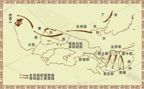 在东汉初年,匈奴就大量进入塞内。46年前后,匈奴国内发生严重的自然灾害,人畜饥疫,死亡大半。而统治阶级因争权夺利,发生分裂。48年,匈奴八部族人共立呼韩邪单于之孙日逐王比为单于,与蒲奴单于分庭抗礼,匈奴分裂为两部。后日逐王比率4万多人南下附汉称臣称为南匈奴,安置在汉朝的河套地区。而留居漠北的称为北匈奴。