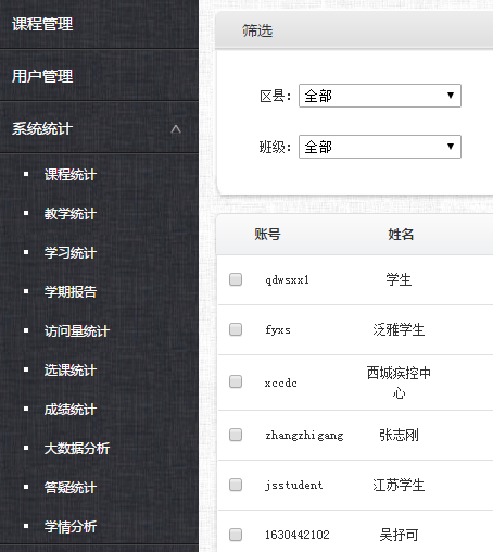 对平台所有用户,所有操作进行大数据统计分析。包括:课程统计、教学统计、学习统计、学期报告、访问量统计、选课统计、成绩统计、大数据分析、答疑统计、学情分析;
