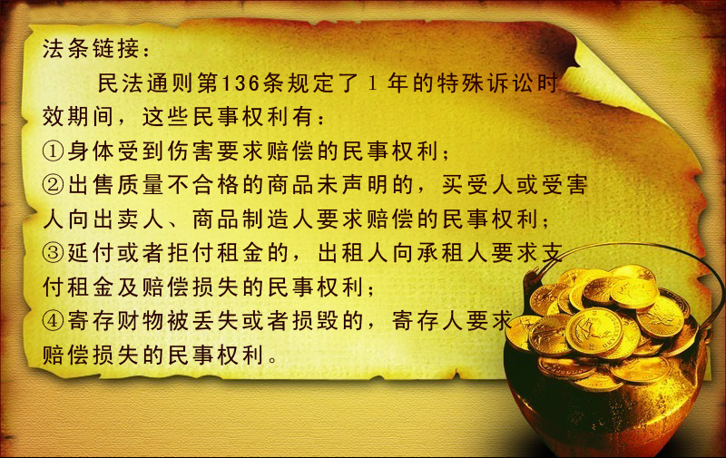 特殊诉讼时效,又称特别诉讼时效。与普通诉讼时效相对应,是由民法典或者单行法规特别规定的只适用于法律特殊规定的民事法律关系的诉讼时效。