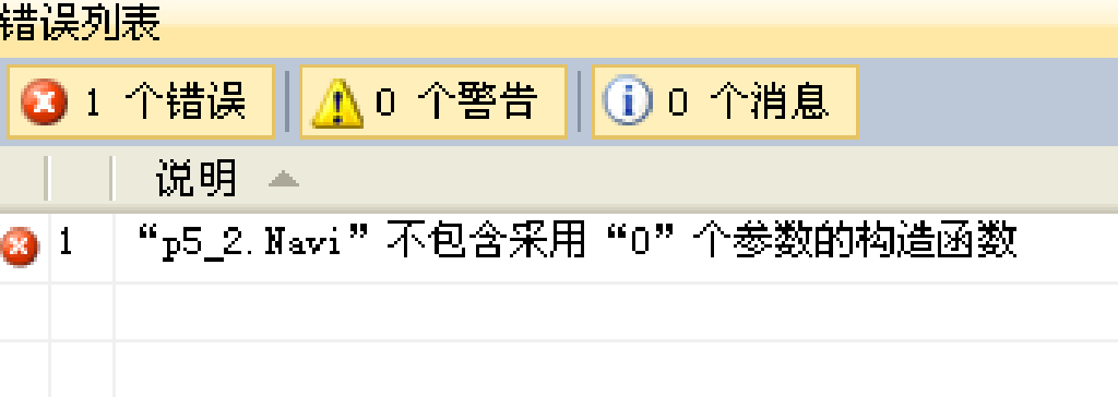 在添加了上述这些构造函数后,再去调试一下程序,大家会发现编译时出现如图5.9所示的错误,错误行指向语句“Navi Tsutey=new Navi();”所在的行,为什么呢?