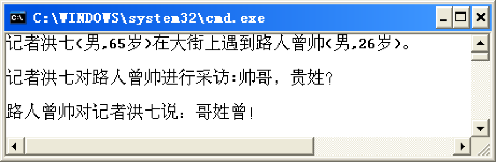 (1)本案例程序代码中定义了一个“记者(Interviewer)”类,包含的字段有姓名name、年龄age、性别sex,还包含一个方法——Interview(Interviewee itvee),用于采访一个路人对象。