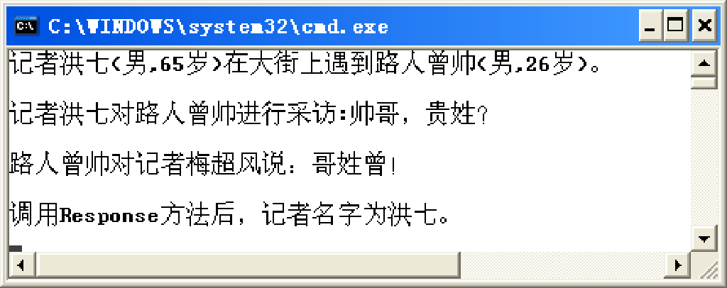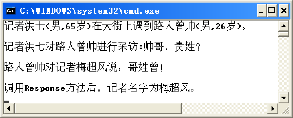 把采访案例程序代码中的Interviewee类的Response方法修改如下,代码的其余部分保持不变: