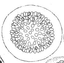 3) 腔球藻属:群体内细胞呈辐射状排列。中国淡水只有2种:纳氏腔球藻和居氏腔球藻。主要区别:纳氏腔球藻细胞长为宽的1~2倍,椭圆形,居氏腔球藻细胞球形或近球形。(胡鸿钧和魏印心书上描述鉴定有些问题?)
