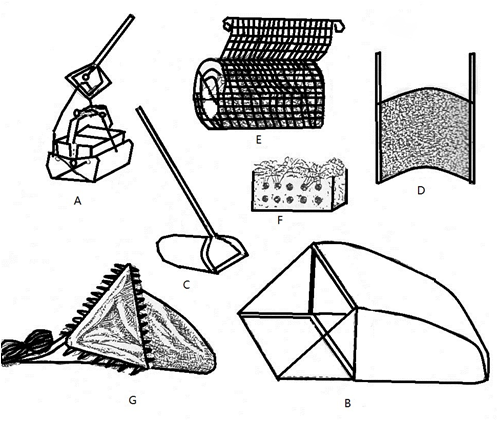 A 彼德生采泥器 B 索伯网 C D形网 E和F人工基质 G 三角拖网