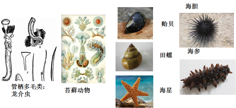 ①底上生活型:在底质上部生活的各种固着动物,如海绵动物、刺胞动物、管栖多毛类、苔藓动物等)、附着动物(如贻贝)和匍匐动物(如腹足类、海胆、海参及海星等棘皮);