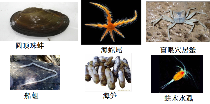 埋栖动物:如大部分多毛类、双壳类、穴居的蟹、棘皮动物的海蛇尾等;