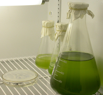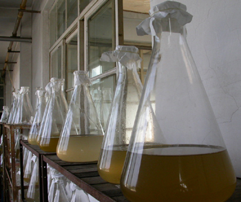 再分离到单纯藻群后,就可接种到培养液中进行培养,进而移养扩大培养。接种方法有液体接种和干藻接种。前者是将藻液直接加入培养液中进行搅拌,加入的藻种分量视水温而定,水温较低(10℃以内)时,多加;约占培养液总量的30~40%左右,水温适宜时(25~30℃左右),可加5~8%左右。后者是用干藻的藻体接种,接种量为0.1~0.2%。