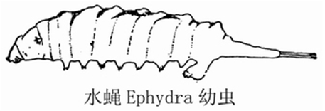 常见种类为水蝇Ephydra幼虫,多分布在水草和丝状藻类丛生处。盐水、淡水或碱水中都可生活,甚至个别种可在石油坑内发现。