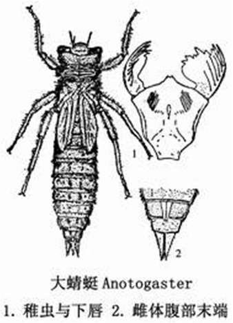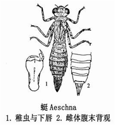成虫通称蜻蜒,体形匀称。善于飞翔,很多种类在飞翔过程中进行摄食、交配与产卵。休息时两翅平置。雌虫卵产到水中、淤泥里、植物体外或植物的组织内。稚虫有宽,略为扁化的腹部,俗称为水虿。有"鱼老虎"之称。为养鱼池内的大害。稚虫体末端具肛门锥体,其呼吸作用是由直肠鳃来完成的。