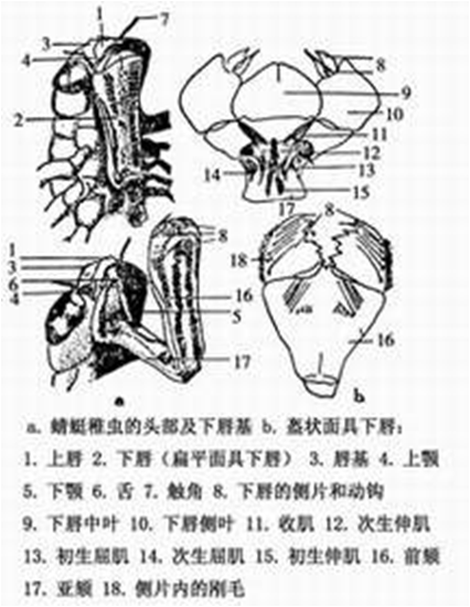 由头部前端突出的部分及头部各节的附肢组成摄食器官-口器。其基本类型为咀嚼式口器和刺吸式口器:如鞘翅目成虫和大多数昆虫幼虫的口器,即为咀嚼式口器。其基本构造由一个上唇,一对大颚(上颚),一对下颚和一个舌组成。