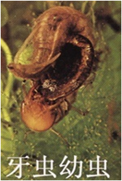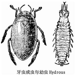 本科亦称水龟虫科,个体在1一50mm之间,触角末端数节膨大,下颚须很长成丝状。另外在胸部腹中央有一刺状突,并有细绒毛在水中呈银白色。个体背面拱起,黑色。头朝下进行呼吸,因气孔在触角最后节的锤状上端。牙虫为杂食性,伤害鱼苗和鱼卵。幼虫为肉食性,它最喜食者为螺类,对鱼苗和鱼卵危害性较大。