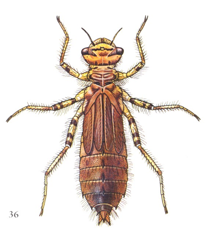 4(5)咀嚼式口器,下唇延长,向后折转而置于前足基部中间,形成罩形下唇。…………………………………………………………………………………蜻蜓目Odonata稚虫