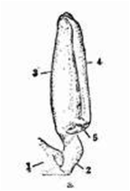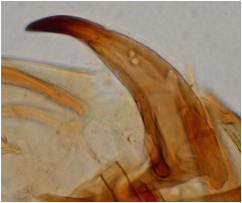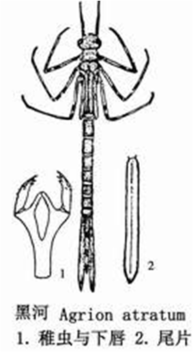 罩形下唇扁平,中片具深沟和两个朝内侧的突起,在中片的末端形成菱形的口,侧片有一动钩和3个不动钩,尾片长,匕首状,中片短于侧片,相当扁化,如黑河Agrionatratum。