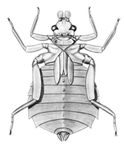 胸 由三节组成。第二和第三节愈合,胸节背面有发育不全的翅芽,掩盖腹部的前端。